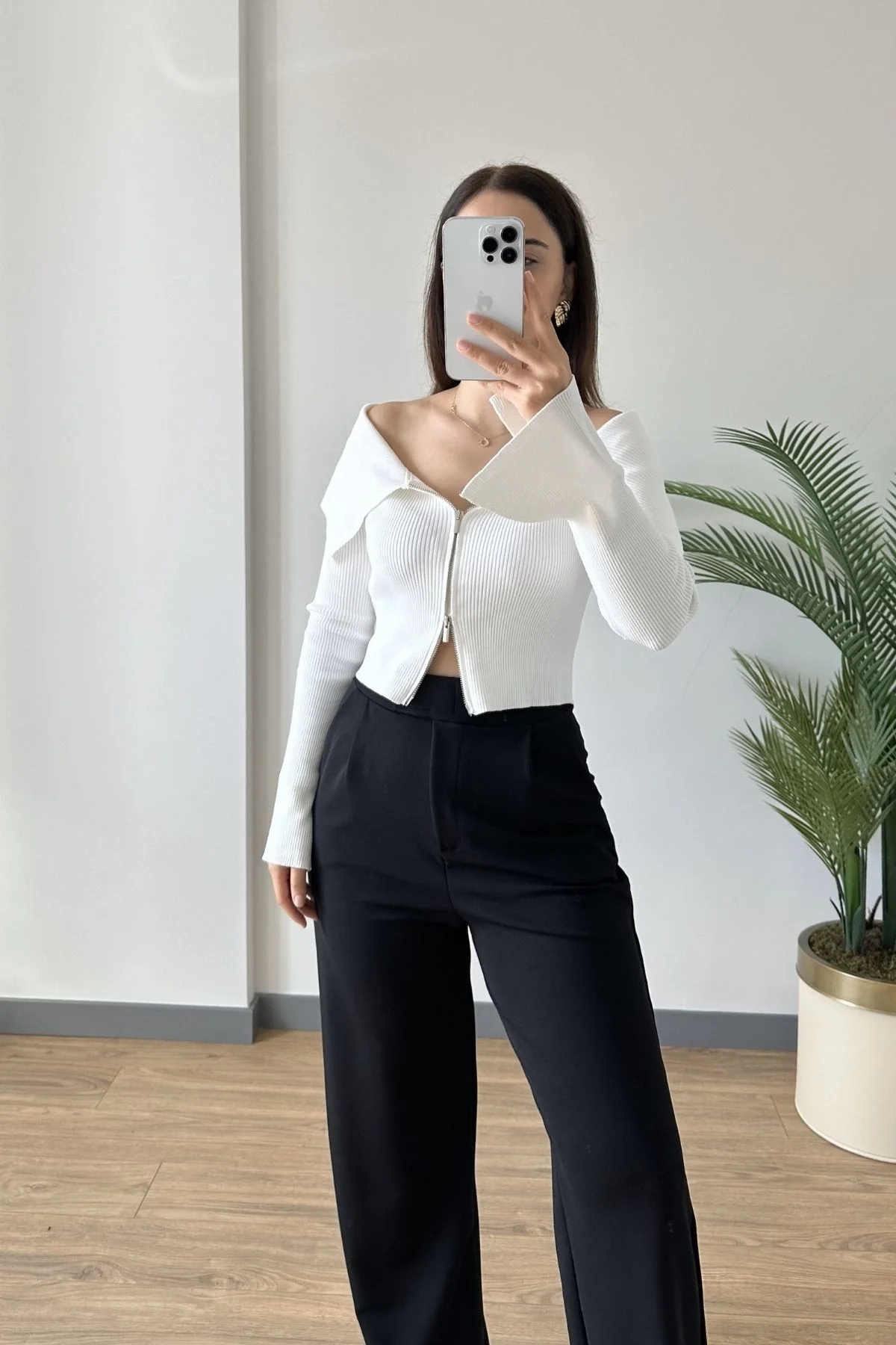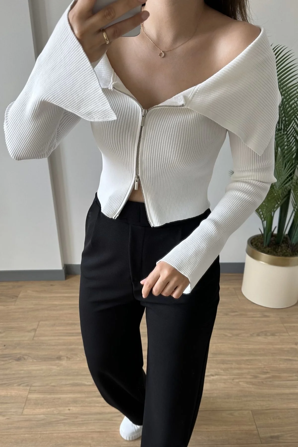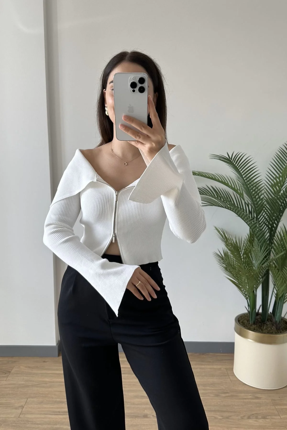 60252 Bardot Yaka Kol Yırtmaç Detay Fermuarlı Hırka EKRU Hakkında