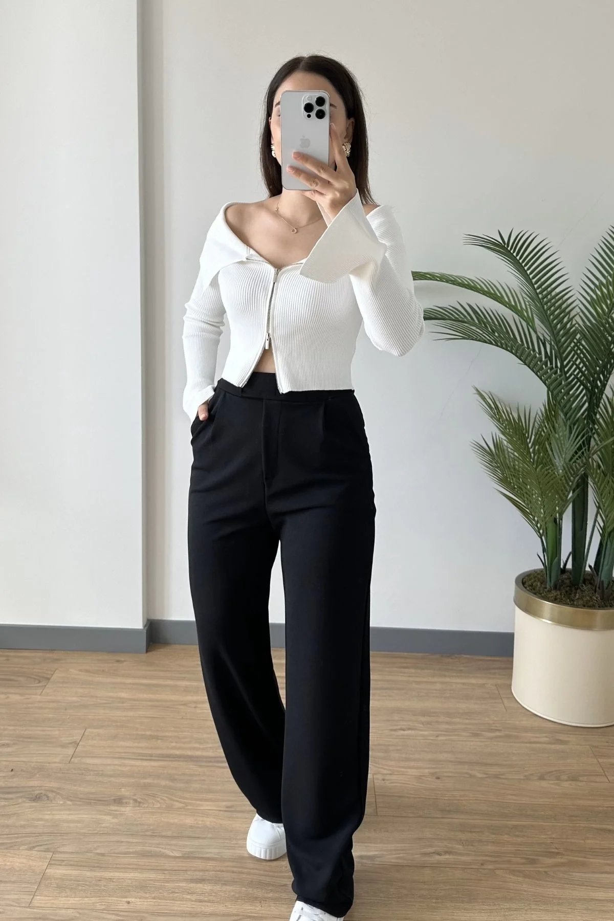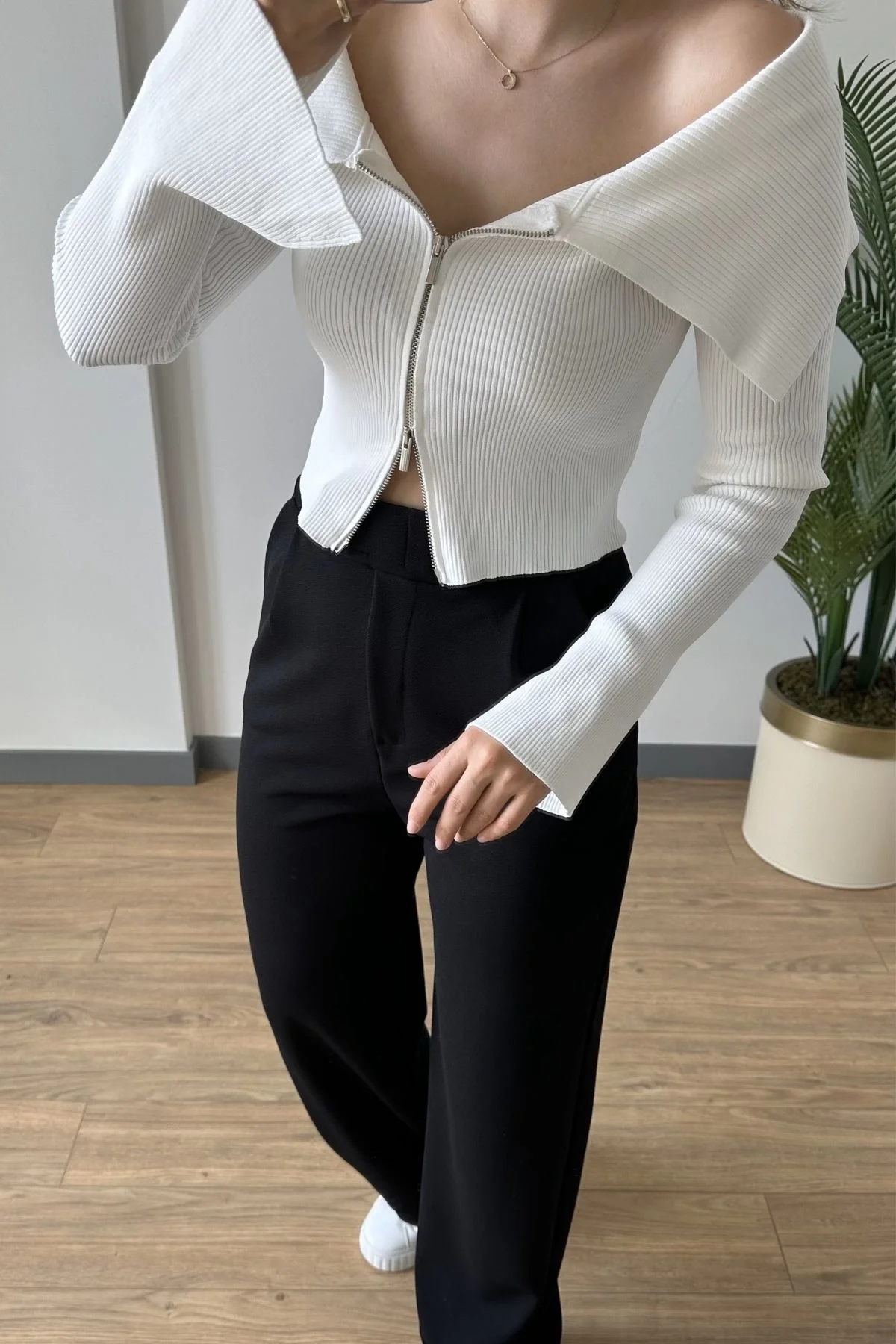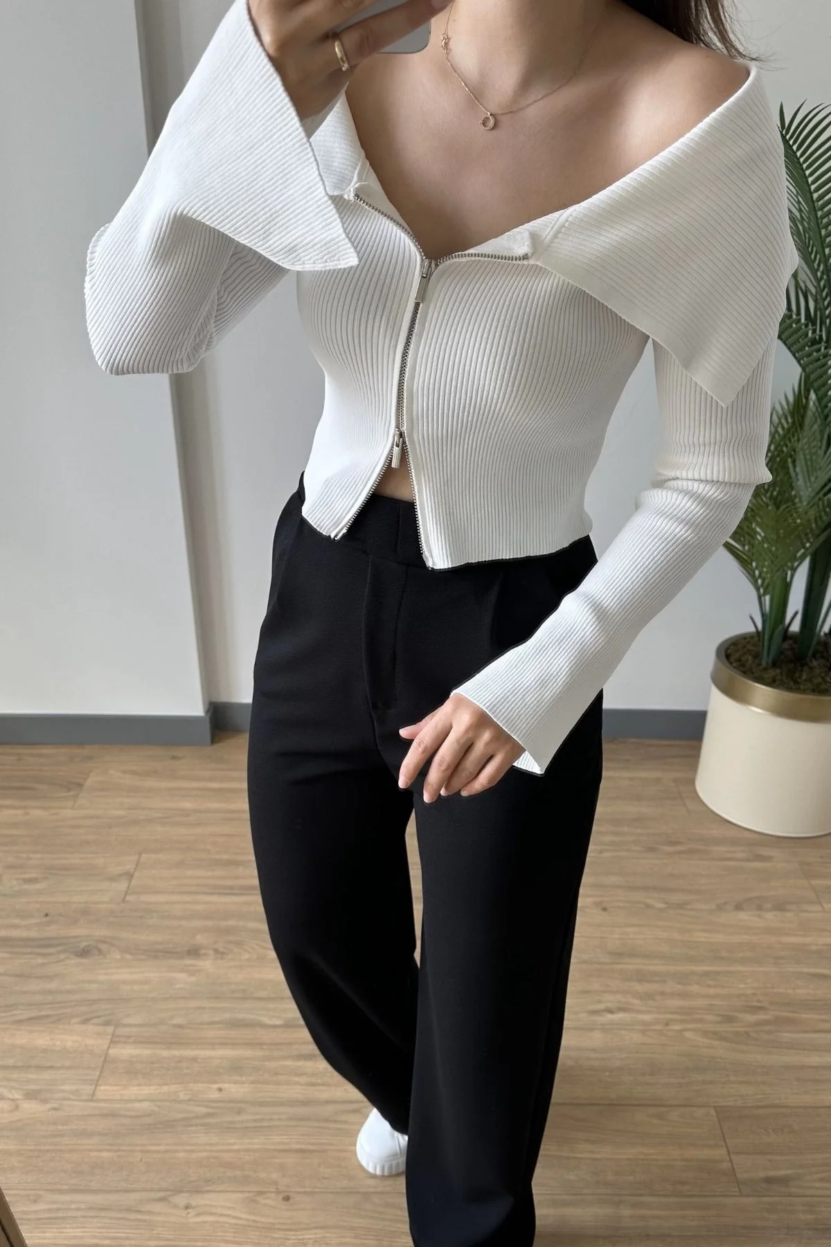 60252 Bardot Yaka Kol Yırtmaç Detay Fermuarlı Hırka EKRU Hakkında